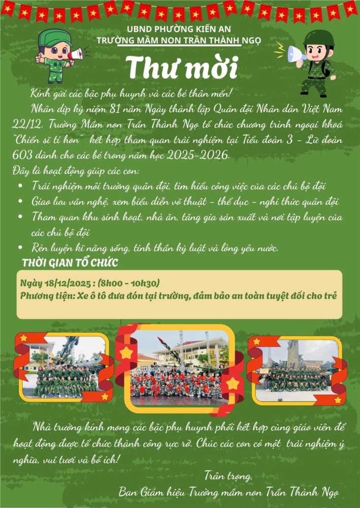 Nhân kỷ niệm 81 năm Ngày thành lập Quân đội nhân dân Việt Nam (22/12/1944 – 22/12/2025) và 36 năm Ngày hội Quốc phòng toàn dân (22/12/1989-22/12/2025) , sáng ngày 18/12, Trường Mầm non Trần Thành Ngọ tổ chức sân chơi “Chiến sĩ tí hon”, tham quan trải nghiệm tại Tiểu đoàn 3 - Lữ đoàn thông tin 603 . Tham dự chương trình có đại diện lãnh đạo Tiểu đoàn 3 - Lữ đoàn thông tin 603; Ban giám hiệu Trường Mầm non Trần Thành Ngọ; các cô giáo, phụ huynh, cùng 460 bé khối 3 tuổi, 4 tuổi và 5 tuổi .